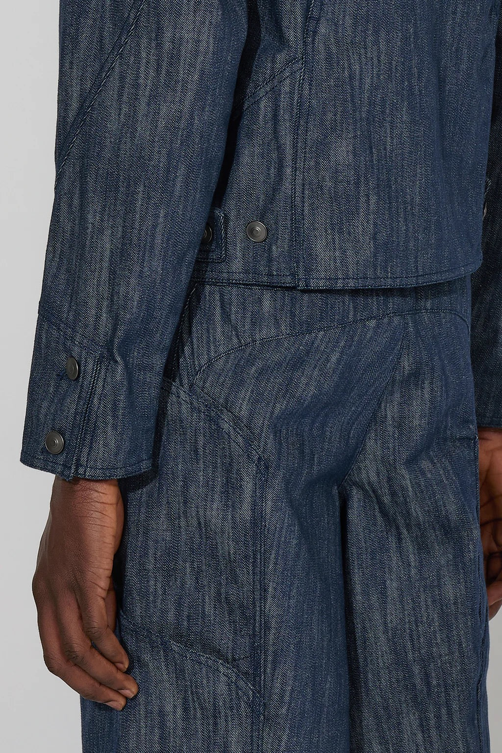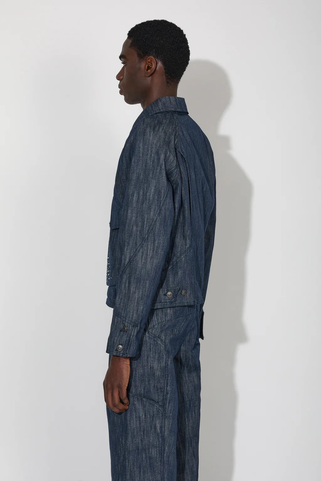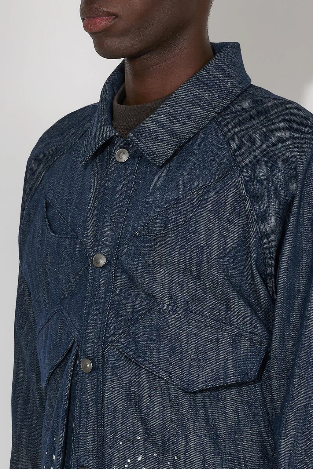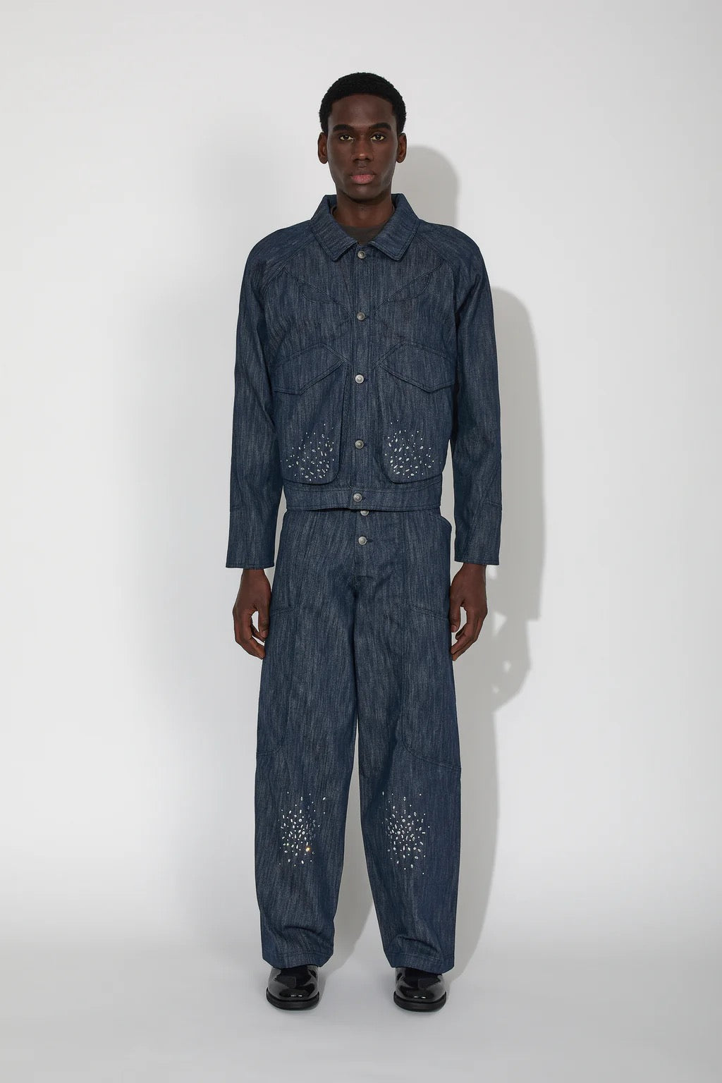 The mantle jacket is constructed from mid-weight denim with a heavily textured finish, featuring an action back for enhanced mobility. Precision detailing is infused in a four-pocket front, while its structured silhouette is shaped through precise tailoring. Crystals are intricately hand-adorned in unique placements on each garment.
