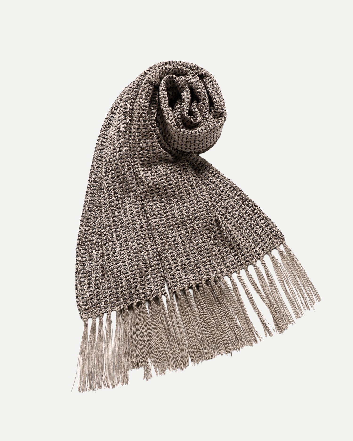 Scarves were an essential item in the styling in the old days. We designed it with a narrower width to propose a layered style under the jacket. The scarf features manually attached fringes made of original twist thread.