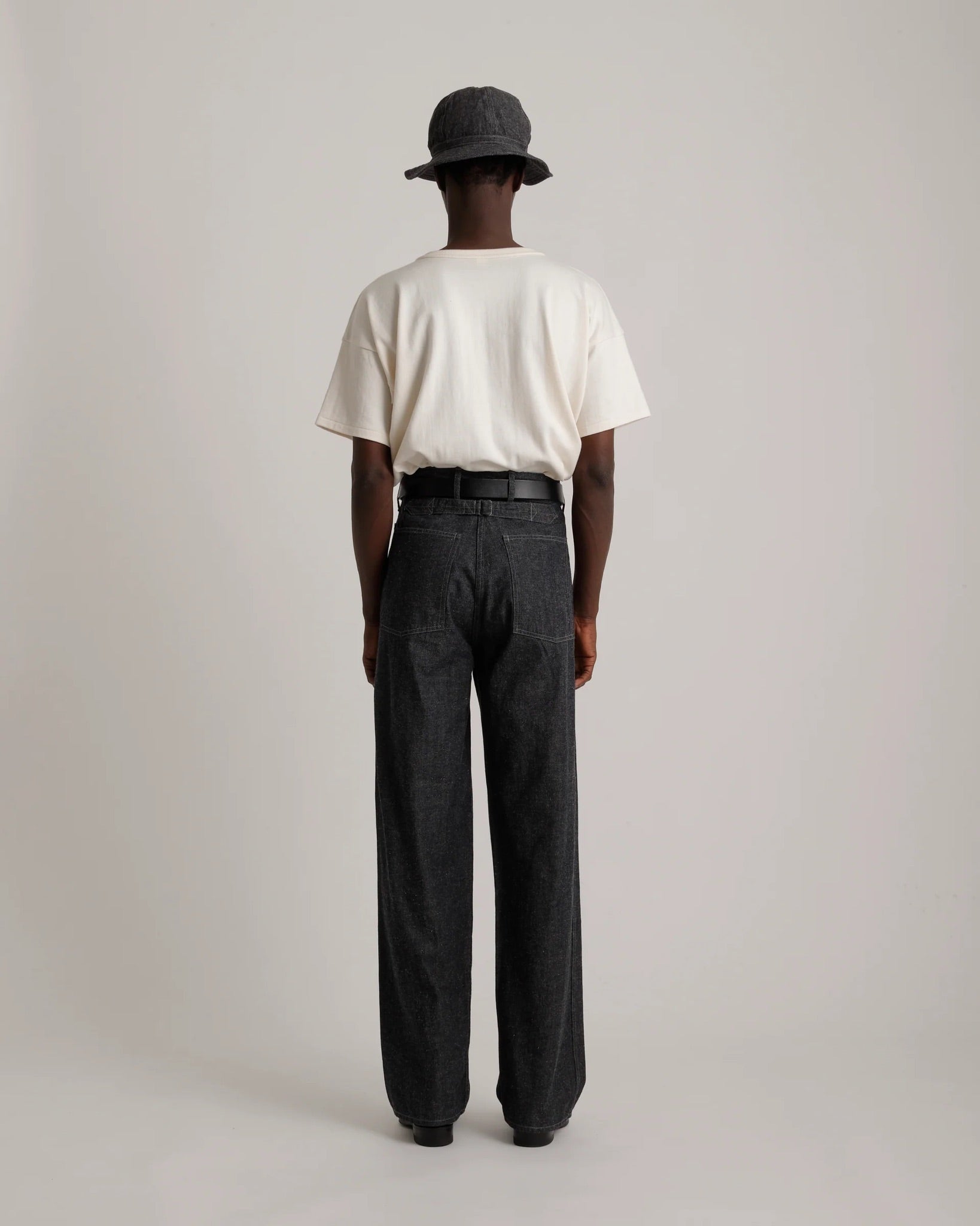 The fabric is a newly developed original 9oz denim, created through analysis of vintage denim from the era. It features green-cast indigo-dyed warp yarns conceived by Taiga Takahashi himself, combined with undyed, natural-toned weft yarns. While preserving the vintage color tone, the yarn count and density were carefully adjusted, resulting in a rich texture distinct from standard left-hand twill denim, thanks to its 1/2 right-hand twill weave.