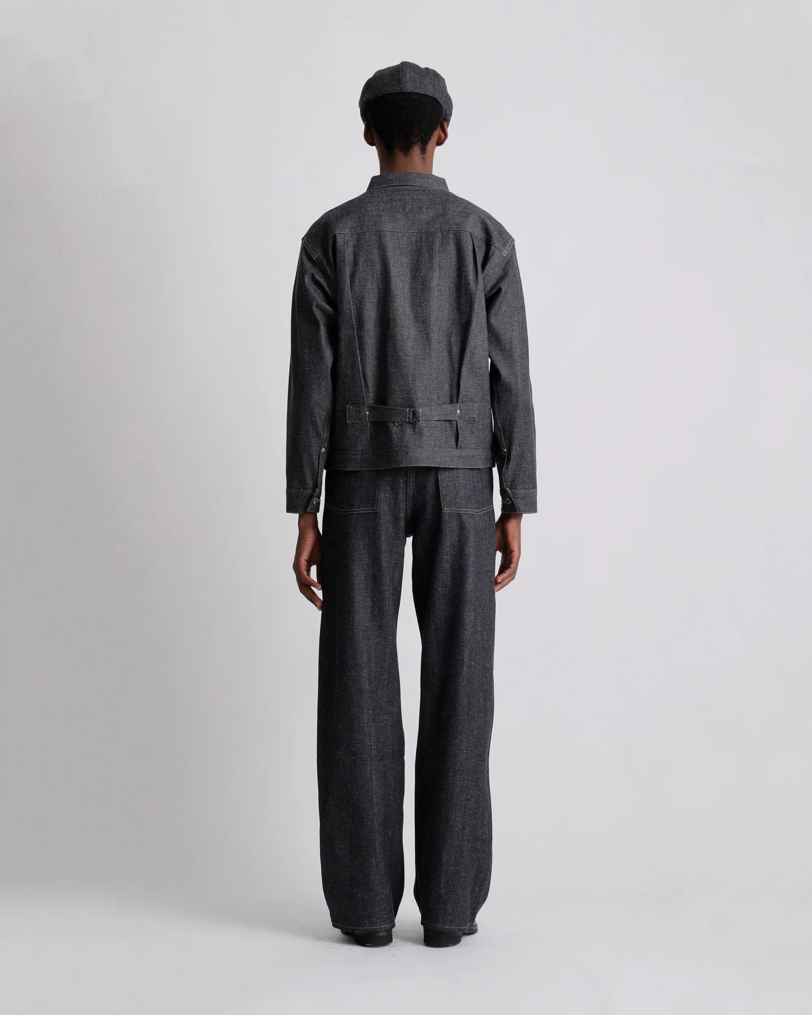 The fabric is selvedge denim with a white edge, which is featured in various parts like the front facing and reverse side of the cuffs. This simple jacket has a patch pocket on one side only, and the pleats on the front are folded with single stitches only. The flat silhouette is characterized by horizontally attached sleeves and flat shoulder lines. The buttons and backside parts marked with original engravings are all made of iron, which is uncoated to produce aged beauty over time. All details from the 1920s were replicated by faithfully following the methods from the time. The signature leather patch is mud-dyed in Amami Oshima Island.